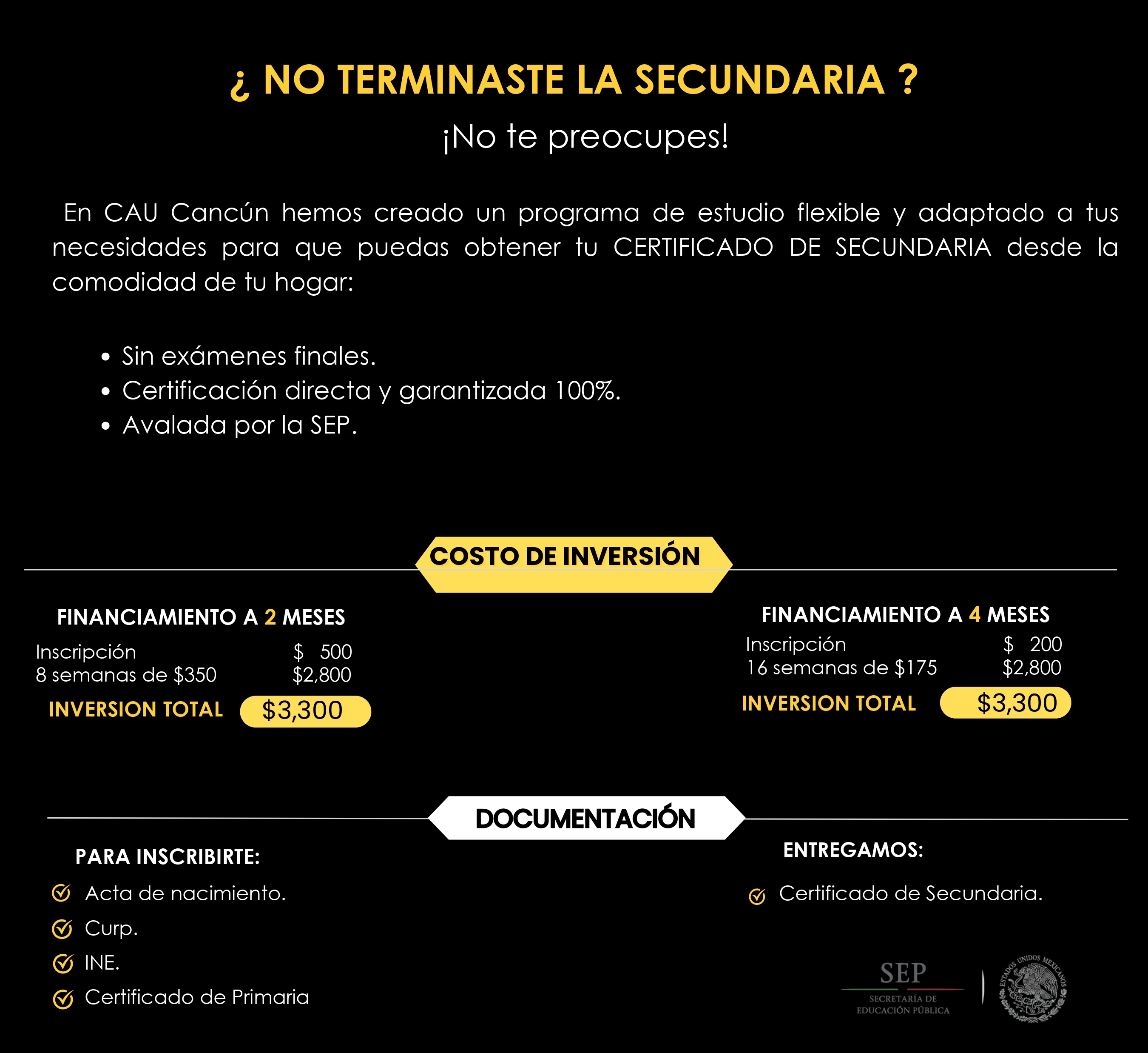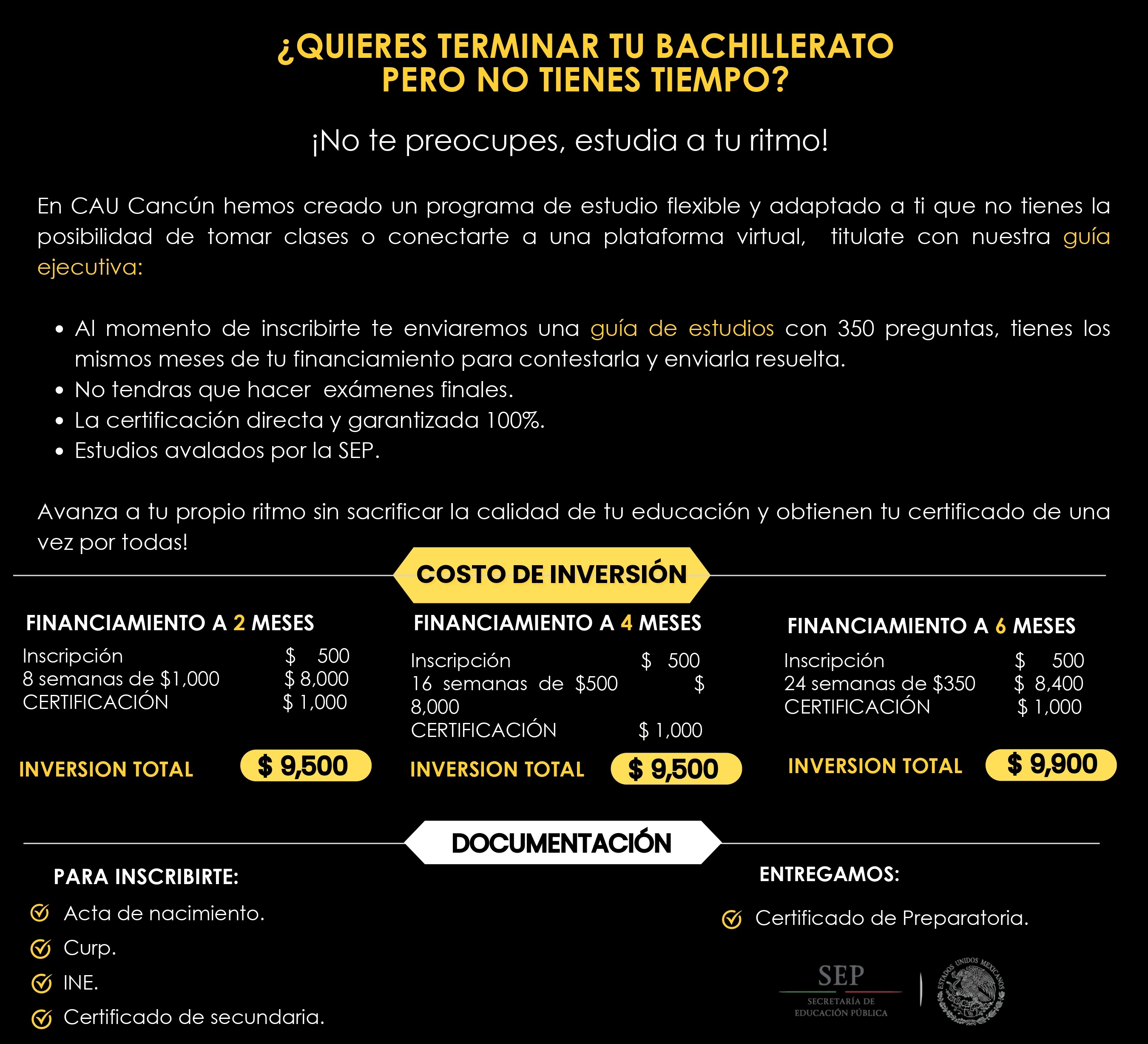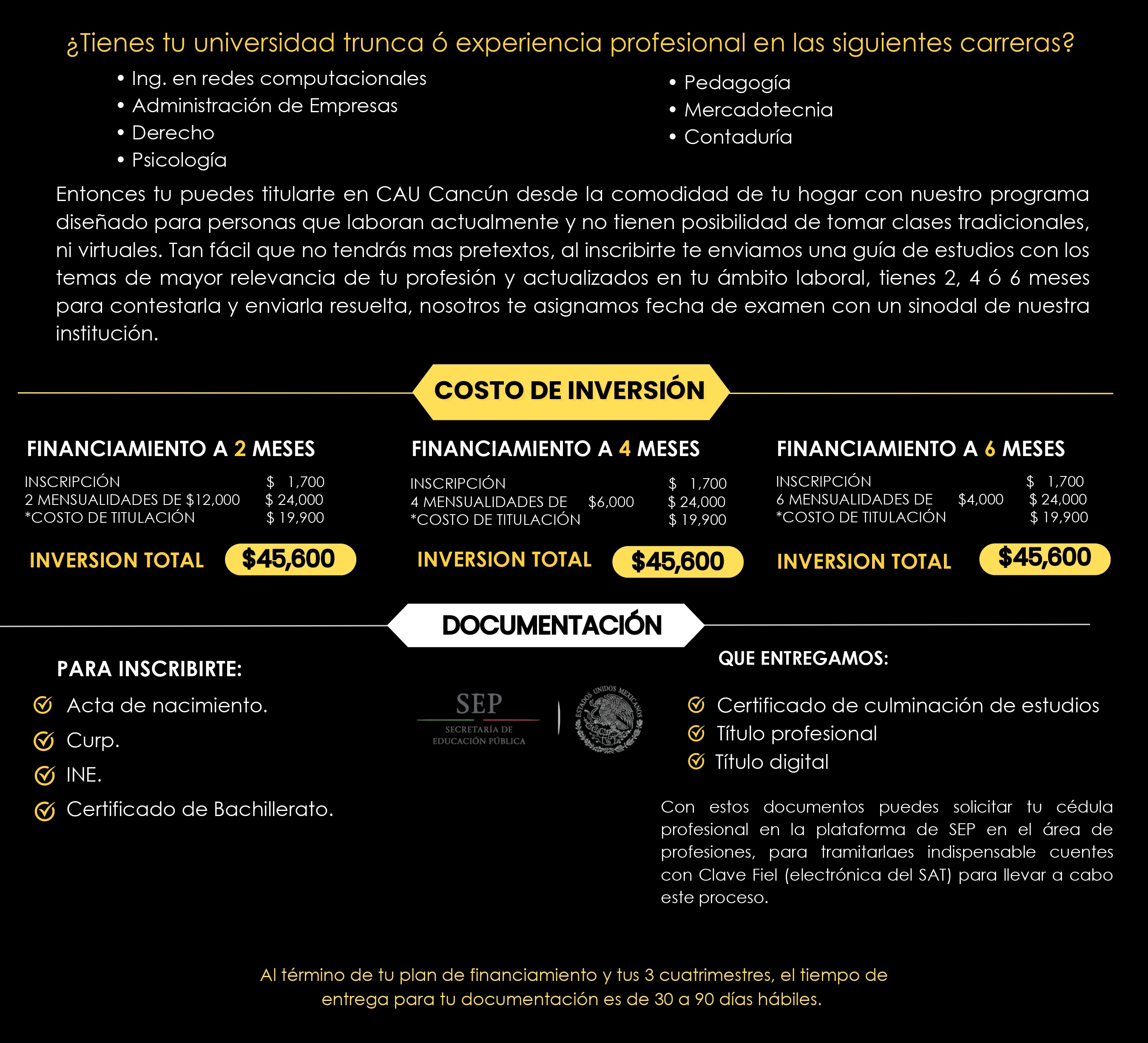 En CAU - Cancún hemos creado programas de estudio flexibles y adaptados a tus necesidades para ayudarte a obtener tu certificado o título desde la comodidad de tu hogar, nos enfocamos en brindarte una educación de calidad y en ayudarte a alcanzar tus metas académicas y profesionales.